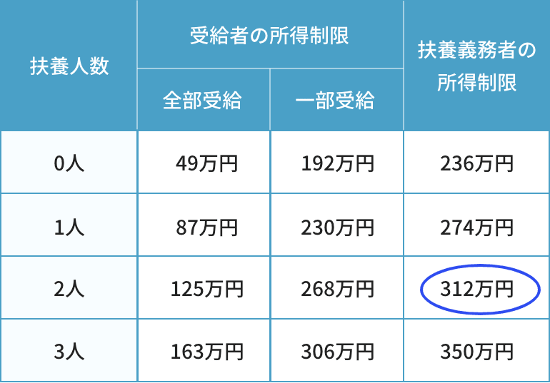 また、受給者が親と同居しているなど、他に扶養義務者がいる場合は、その人に対しても所得制限がかかります。